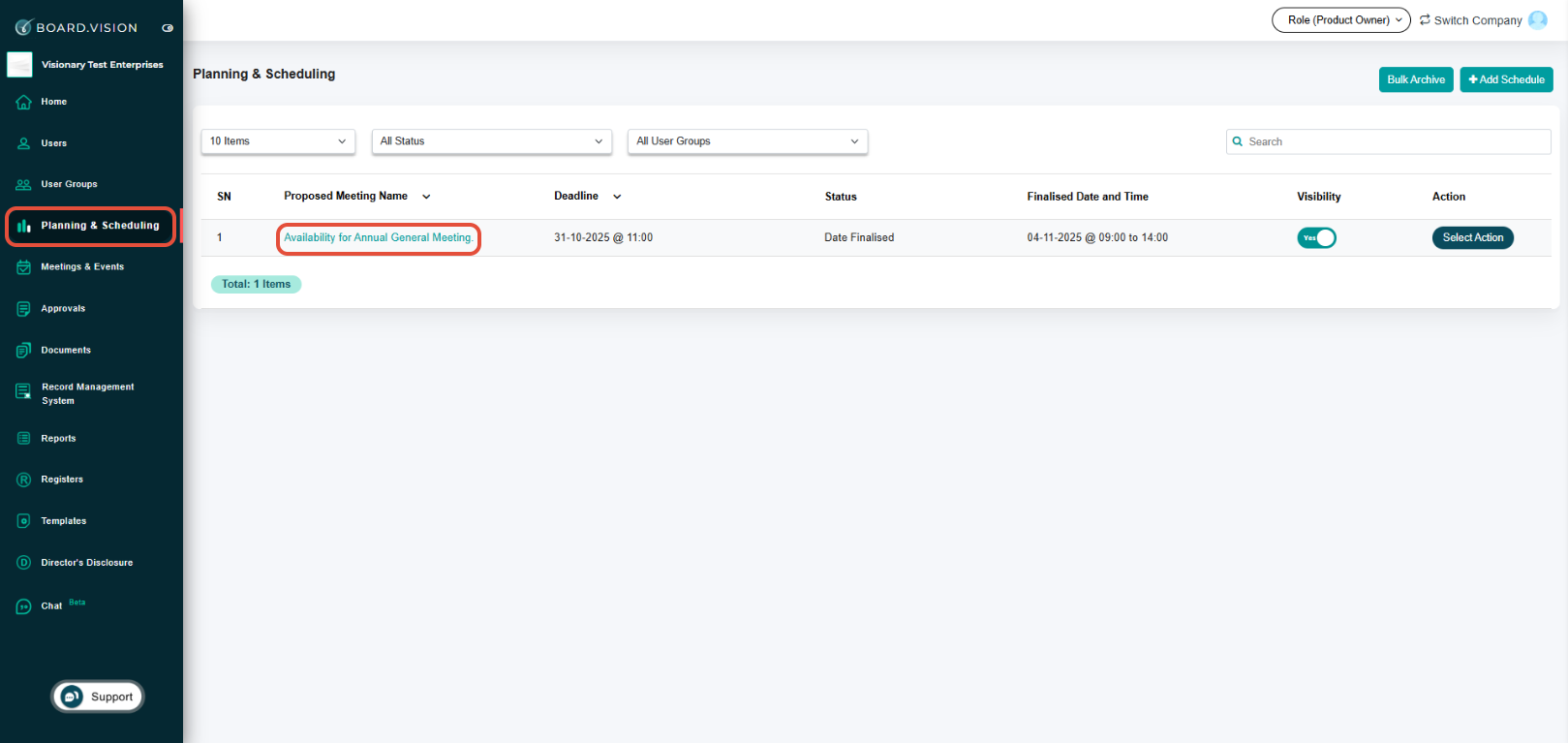 2) From the left navigation menu, go to Planning and Scheduling, and click on the Proposed Meeting Name.