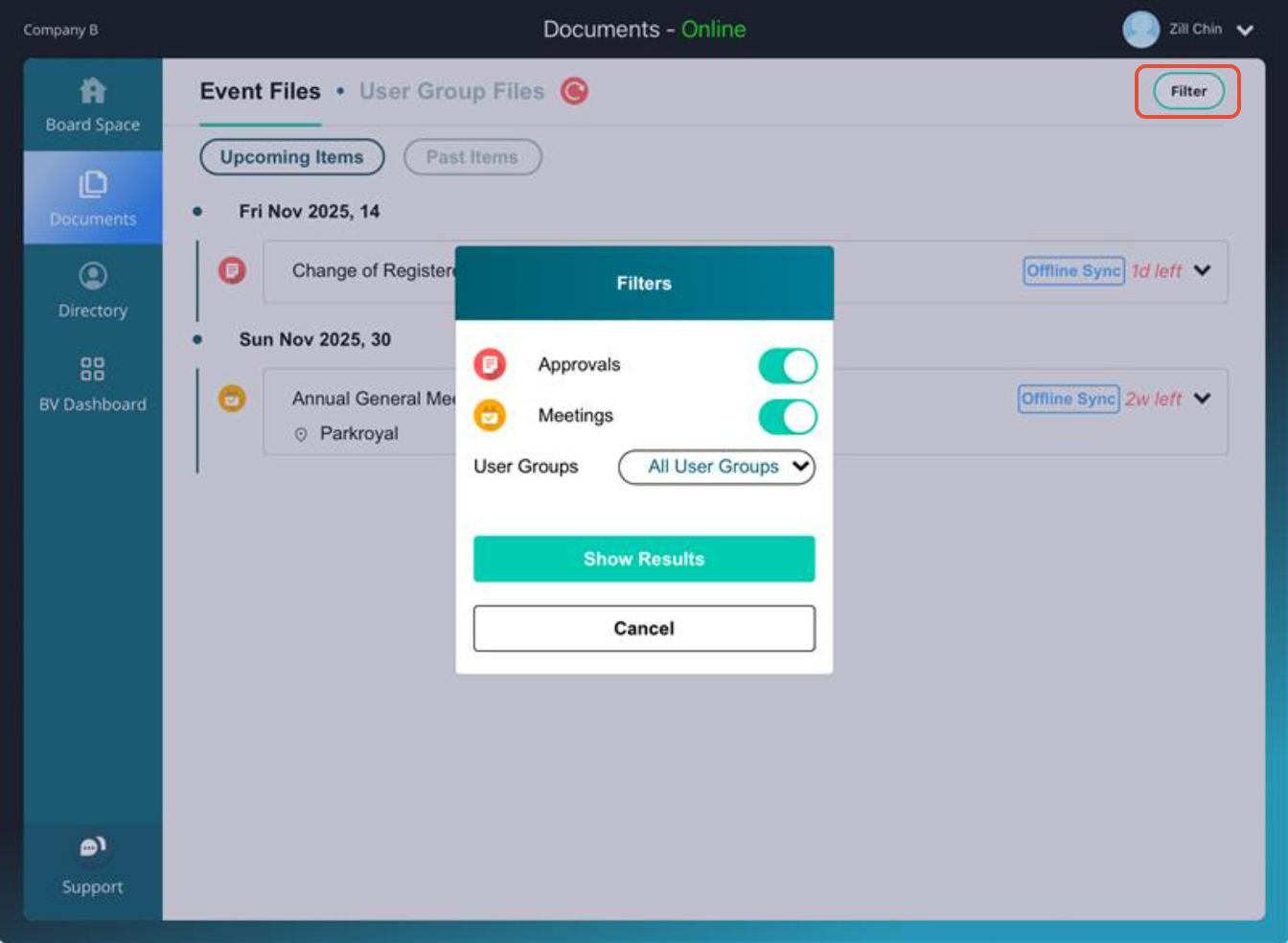 b) On the Filter items by categories pop-up window, toggle on the module you wish to view. Then tap on Show Results