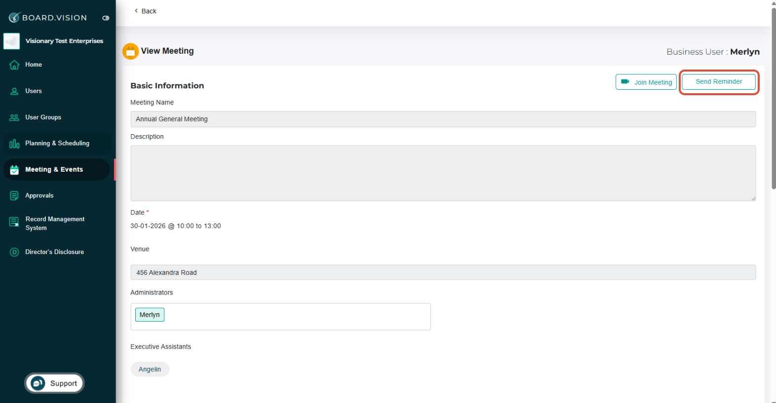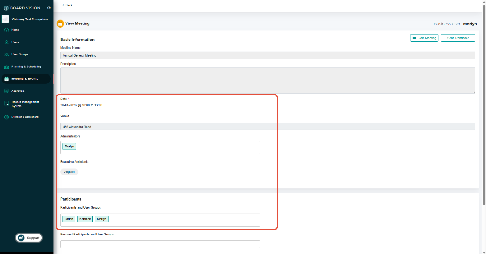 5) On the View Meeting page, you can view the meeting's basic information such as date and time, venue, and participants.