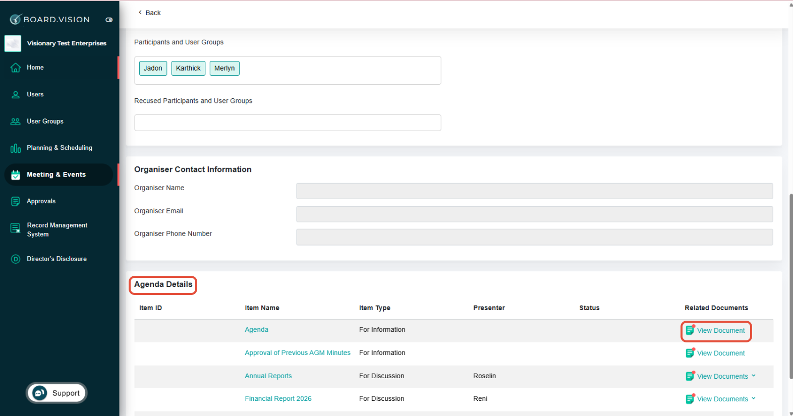 Important Note: You can view the meeting agenda details and documents only with the Administrator's permission.