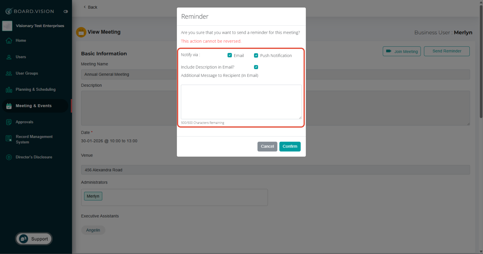 2) On the Reminder pop-up window, select to notify your Director via email and/or push notification. You may enter an additional message within the white box provided, which will be included in the email to the recipient. Then, click on Confirm.
