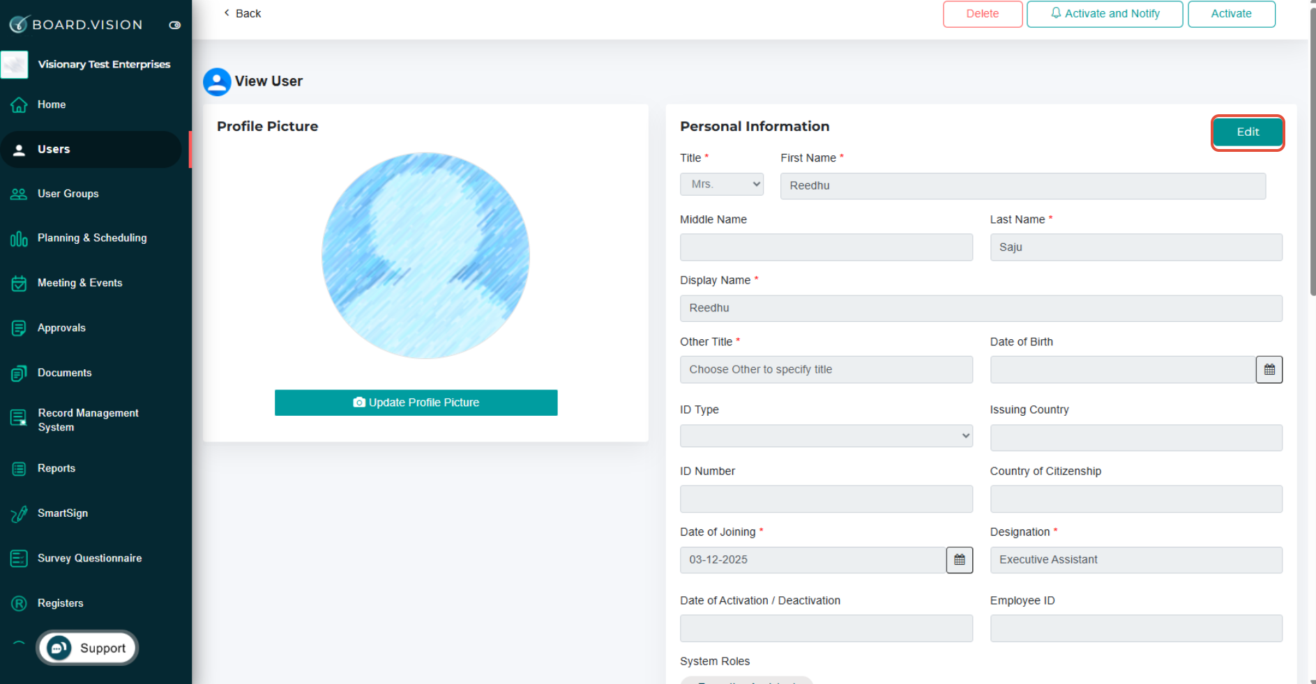 2) From the left navigation menu, go to Users, and click on an Executive Assistant with Draft status.