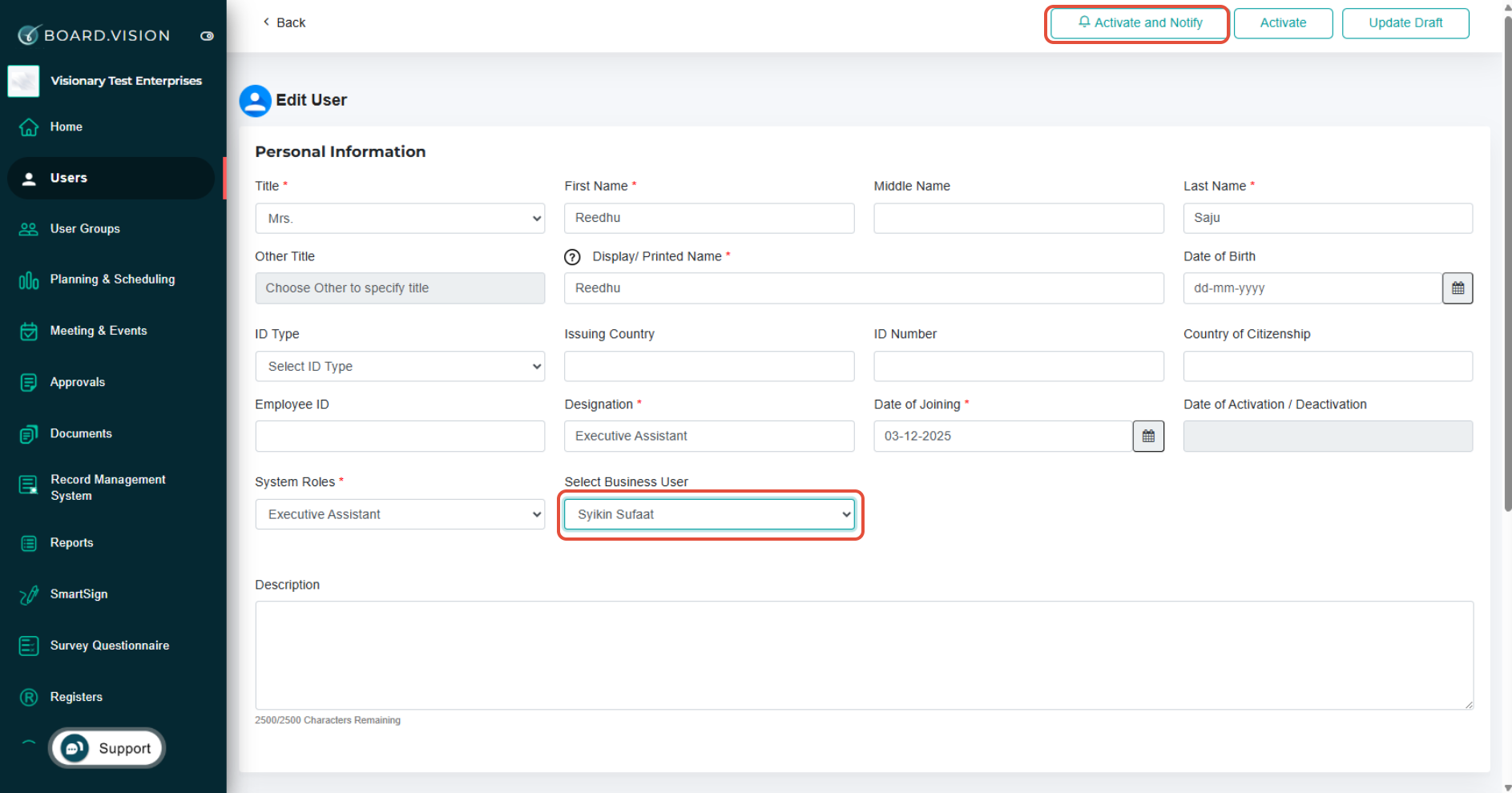 4) Then, you will be directed to the Edit User page. Under the System Role, you will be able to see the Business User dropdown box. Select the Business User from the dropdown list then click on Activate and Notify.