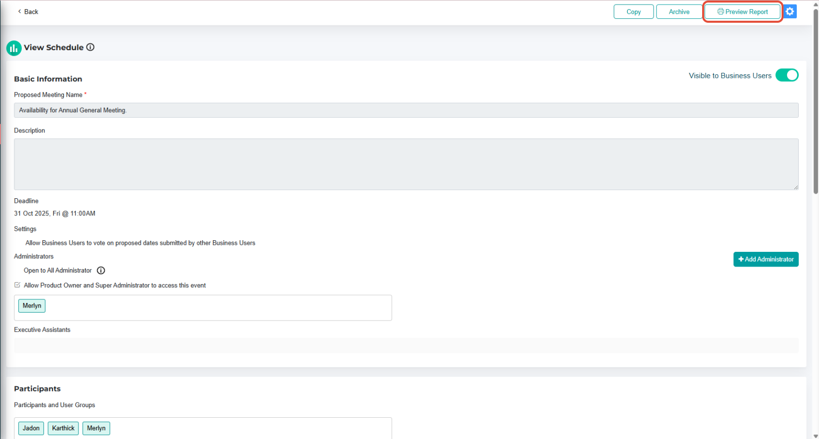 3) On the View Schedules page, click on Preview Report at the top right. The schedule information report will be opened in a new tab.