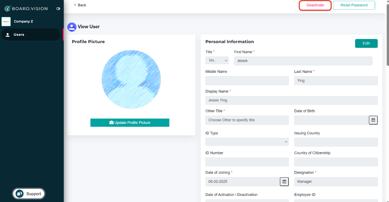 Important Note: You can only deactivate users with an Active, Invitation Sent and Invitation Expired Status.