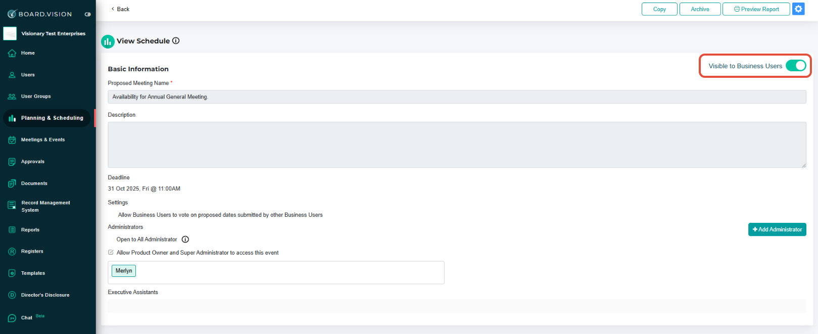 3) On the View Schedule page, click on the Visible to Business Users toggle button.