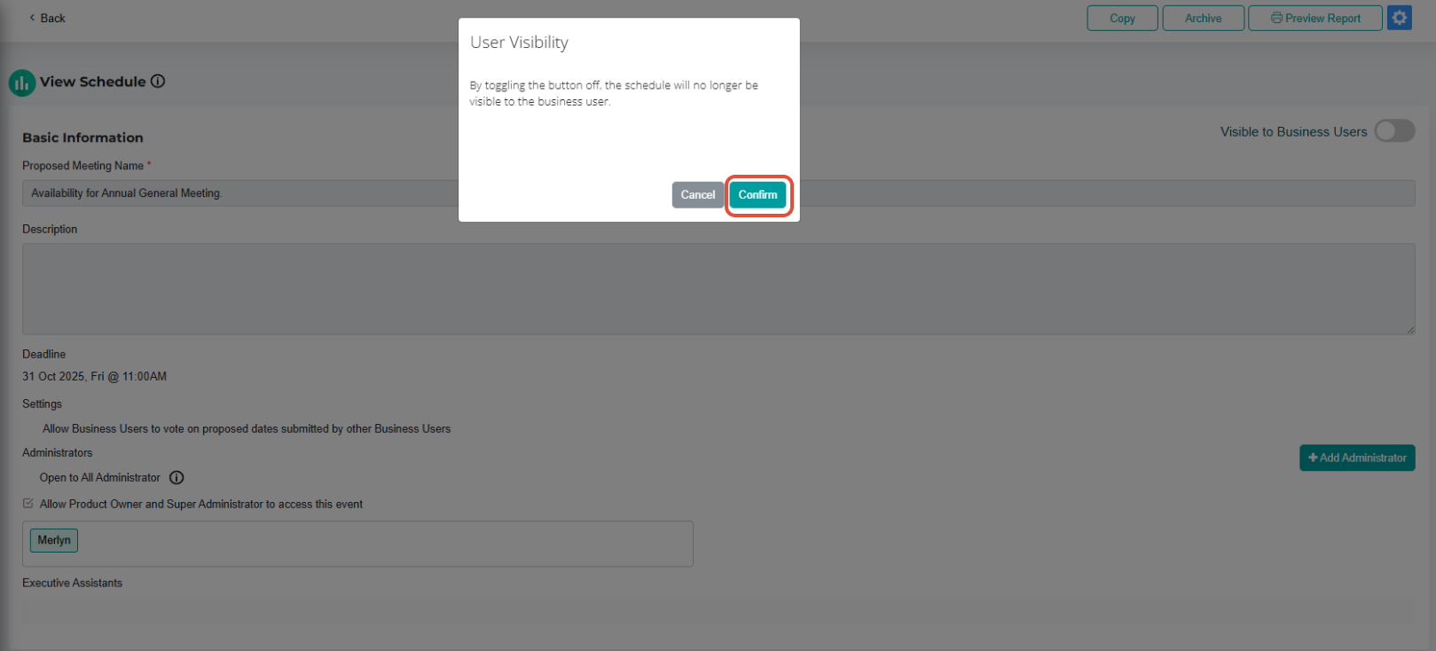 4) Upon clicking on the Visible to Business Users toggle button, a User Visibility window will pop up. Click on Confirm to switch it off.