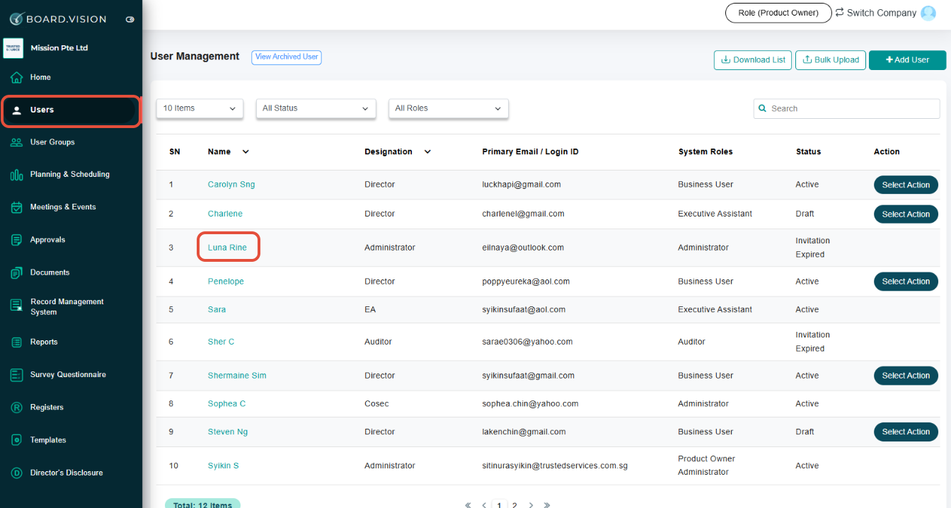 2) From the left navigation menu, go to Users, and click on the User's Name.