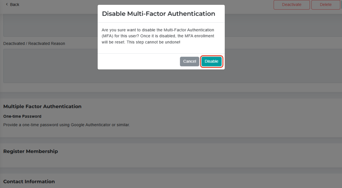 Once disabled, the User will no longer be required to enter a One-time Password (OTP) using Google Authenticator (or similar) upon logging in.