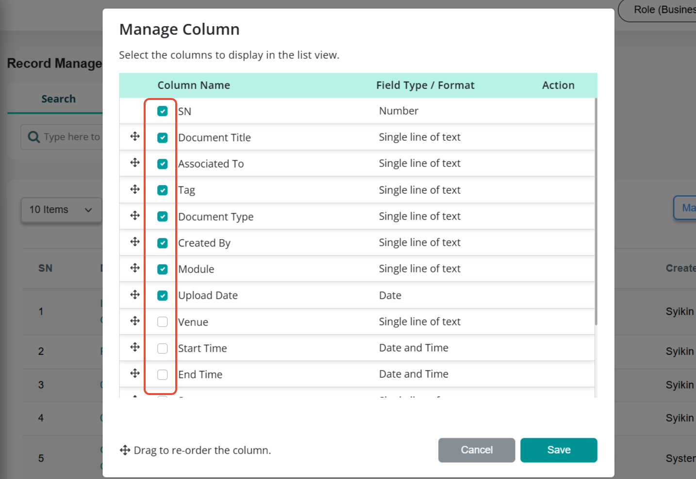 4) A list of available columns will be displayed on the "Manage Column" pop-up window.
