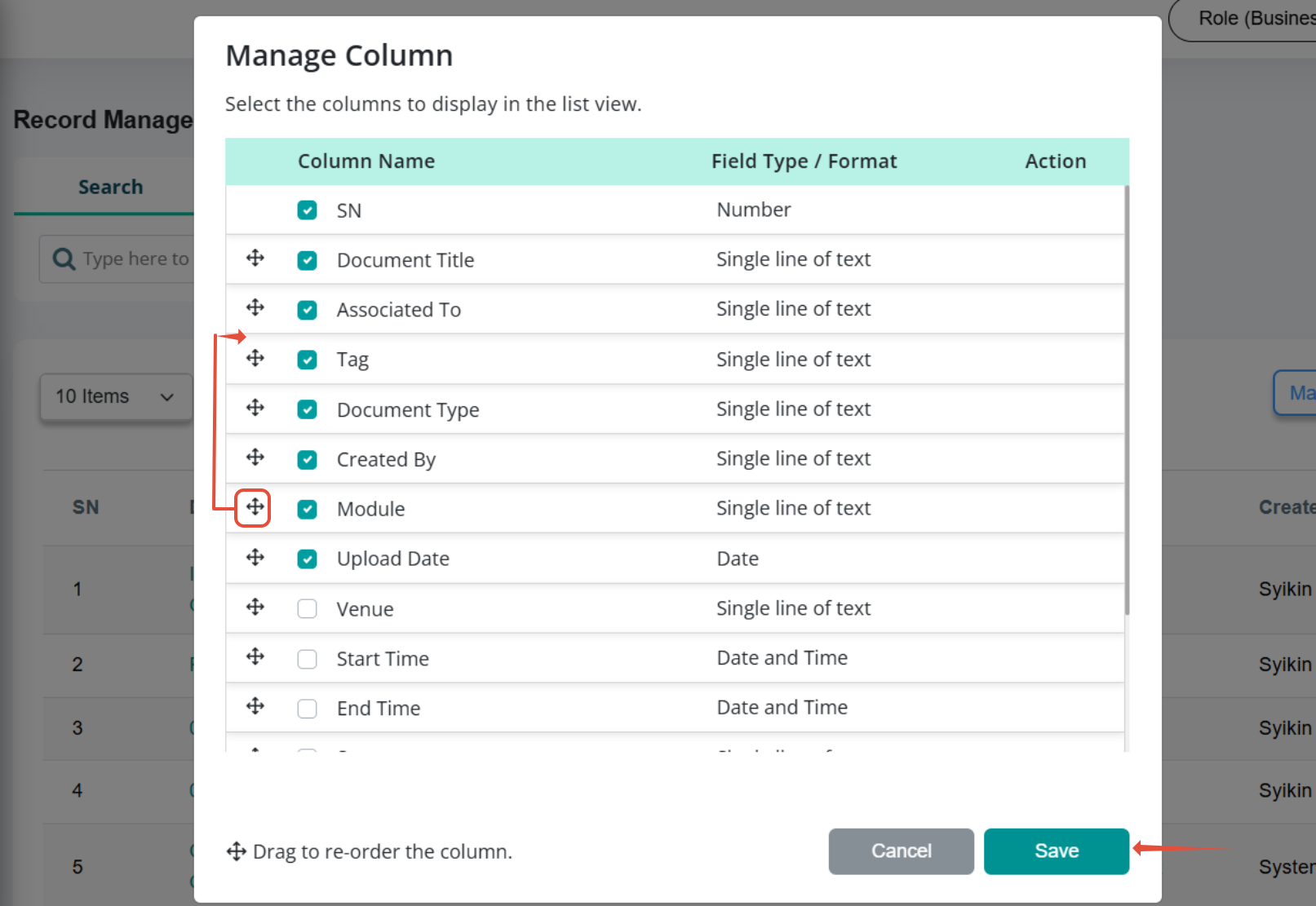 5) To reorder the columns, click and drag the column names to reorder how they appear in your document list.